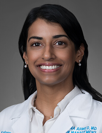 As a physician, Dr. Ahmed sought to pursue a career that combined knowledge of the human body, hands-on procedural skills, and service to others. She sees patients for various pain conditions, including back pain, neck pain, hip pain, knee pain or other joint pain, and nerve pain conditions. When appropriate, Dr. Ahmed offers treatments such as epidural steroid injections, medial branch blocks, radiofrequency ablation, sacroiliac joint injections, ultrasound-guided nerve blocks, trigger point injections, Botox injections, bursa injections, intra-articular joint injection, spinal cord stimulators, peripheral nerve stimulators, and medication management for pain. Her favorite part of practicing medicine is using her knowledge and training to make a difference in someone's health.