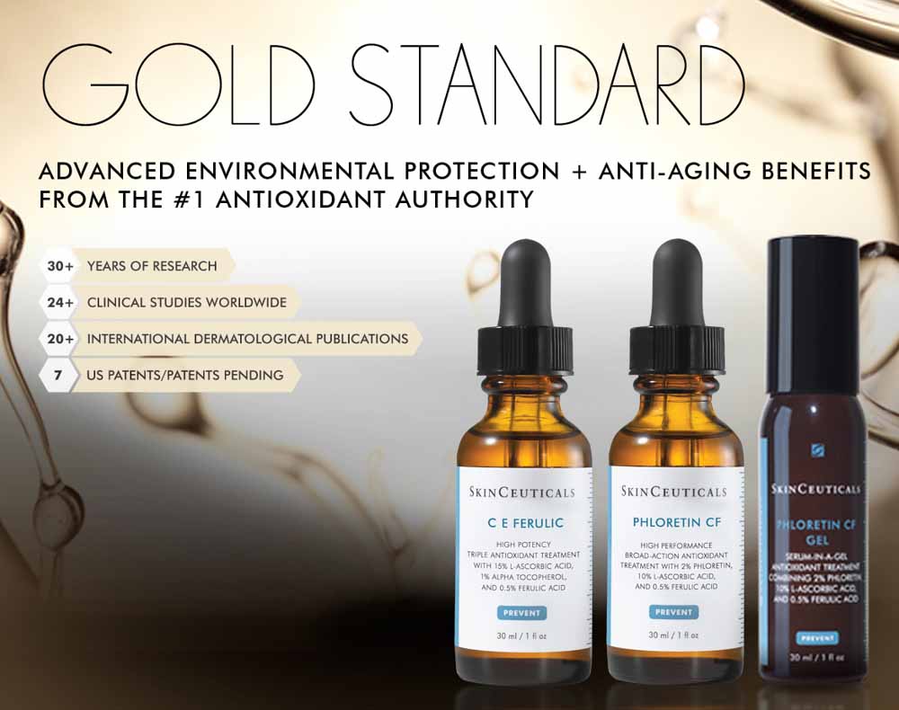 SkinCeuticals daytime antioxidants C E Ferulic® (for dry, sensitive or mature skin) and Phloretin CF® (for oily or combination skin), are demonstrated to help neutralize free radicals caused by atmospheric aggressors.