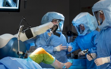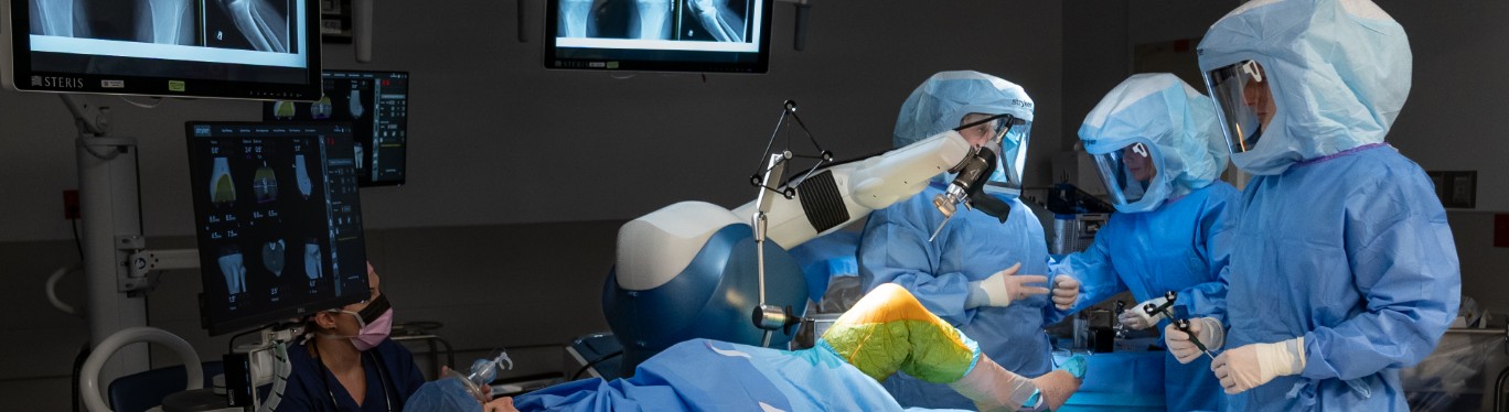 Surgical staff use Mako SmartRobotics during a partial knee replacement procedure at the Memorial Villages Campus Ambulatory Surgery Center.