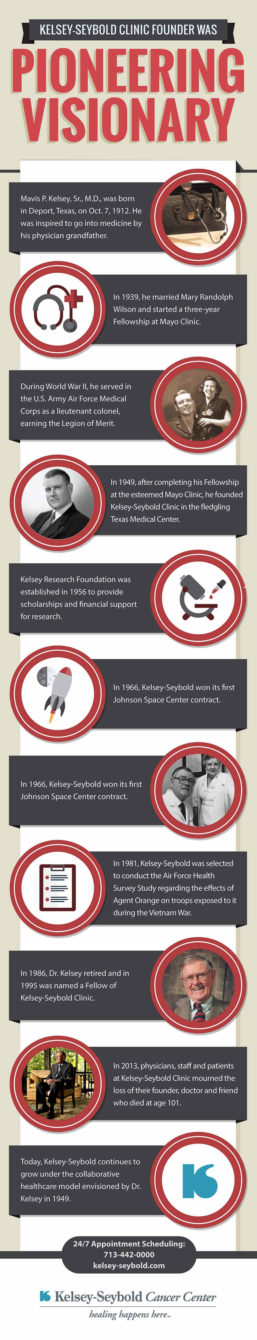 Dr. Kelsey brought with him his young family and his dream of establishing a premier medical group that would offer the Mayo Clinic model of medical care. His dream became a reality when he founded Kelsey-Seybold Clinic in the Texas Medical Center in 1949.